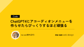 コーディングChatGPT4にアコーディオンメニューを作らせたらびっくりするほど頑張る 以前、公開した記事の時点ではChatGPTは3.5だったのですが、今回どうようの内容でどのくらい違いが出るのか試してみたいと思います。結論から言うと、ChatGPT4やばいね。 サンプル メニュ...2023.03.19コーディング