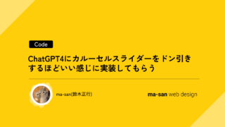 コーディングChatGPT4にカルーセルスライダーをドン引きするほどいい感じに実装してもらう ChatGPT4が公開されて巷で阿鼻叫喚というか歓声というか、盛り上がっていますね。私もその一人です。というわけでChatGPT4でどこまでコーディングが可能なのかということでカルーセルスライダーを実装してもらってみました。 ...2023.03.20コーディング